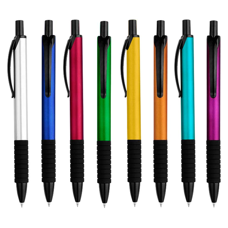 Bolígrafo «Vulcano» con cuerpo de color metalizado opaco y terminales negros. Escritura azul.