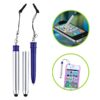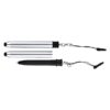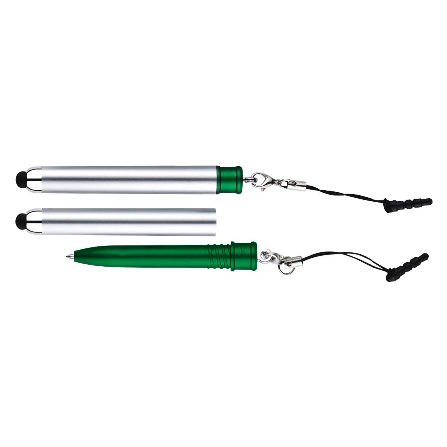 Bolígrafo «Touch-Screen» con tapa plateada y goma posterior negra para pantalla táctil. Incluye práctico soporte plástico para insertar en la salida de auricular del iPhone. Escritura azul.