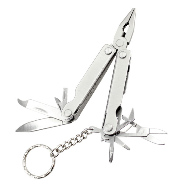 Multiherramienta metálica plegable de 10 funciones, con llavero. Incluye mini-regla en cm y pulgadas. Presentación en estuche de polyester negro y caja plateada de regalo.