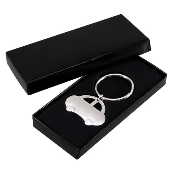 Llavero Metálico Automóvil. Presentación en estuche laminado negro con cuna aterciopelada.