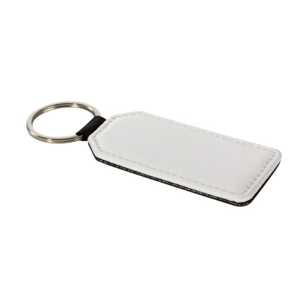 Llavero rectangular con forma «bandera» de PU blanco para sublimación. Reverso capa PU negro con brillo (no sublimable). Argolla de Acero inoxidable.