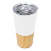 Mug de metálico doble pared aislante, interior Acero inoxidable 201 SS, exterior cubierta inferior de bamboo y cubierta superior de Acero inoxidable 304 SS, modelo «AURUS». Producto BPA FREE, para el contacto con líquidos y alimentos. Fondo de silicona negra ABS anti-deslizante. Tapa removible de plástico PS Crystal Clear con sello cilíndrico de silicona y sistema de cierre/apertura antiderrame. Capacidad 500ml. Presentación en bolsa OPP + caja de regalo de cartón kraft.