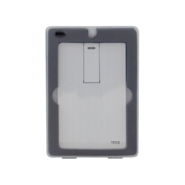 USB 2.0 Pendrive memoria de 16GB, forma y tamaño Tarjeta de Crédito 100% plateado, con USB twist-system. Presentación en elegante estuche de plástico translúcido con cierre imantado, dentro de cuna de esponja EVA negra.